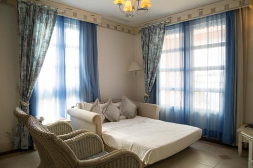 A sala com um sofá cama para de dimensão um pouco menor do que de cama de casal é integrada à cozinha.
