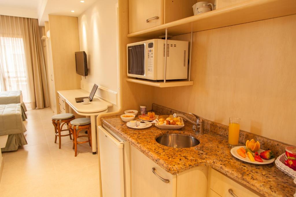 Quarto integrado com uma mini cozinha, incluindo micro-ondas e utensílios básicos,